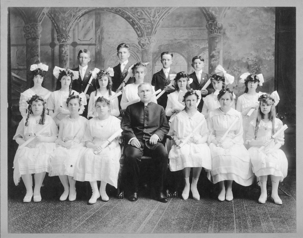 St. Benedicts Yearbook – 1921 – The yearbook is titled “The Maroon Telolog” and is in the possession of Bernard (Bud) L. DuPlessis, III. Margaret DuPlessis inserted a note stating that Father William married them. On page 38 we learn that his pet diversion is “Reading all the newspapers he can lay hand on.” which is no surprise to those who knew him. In the photo “Class of Nineteen Twenty-One”, he is the second from left on the top row. In the photo “The Editorial Board”, he is seated at the table next to the two priests. The table still exists and his grandsons Bernard and James M. had the priveledge of being photographed at that table c 2003.